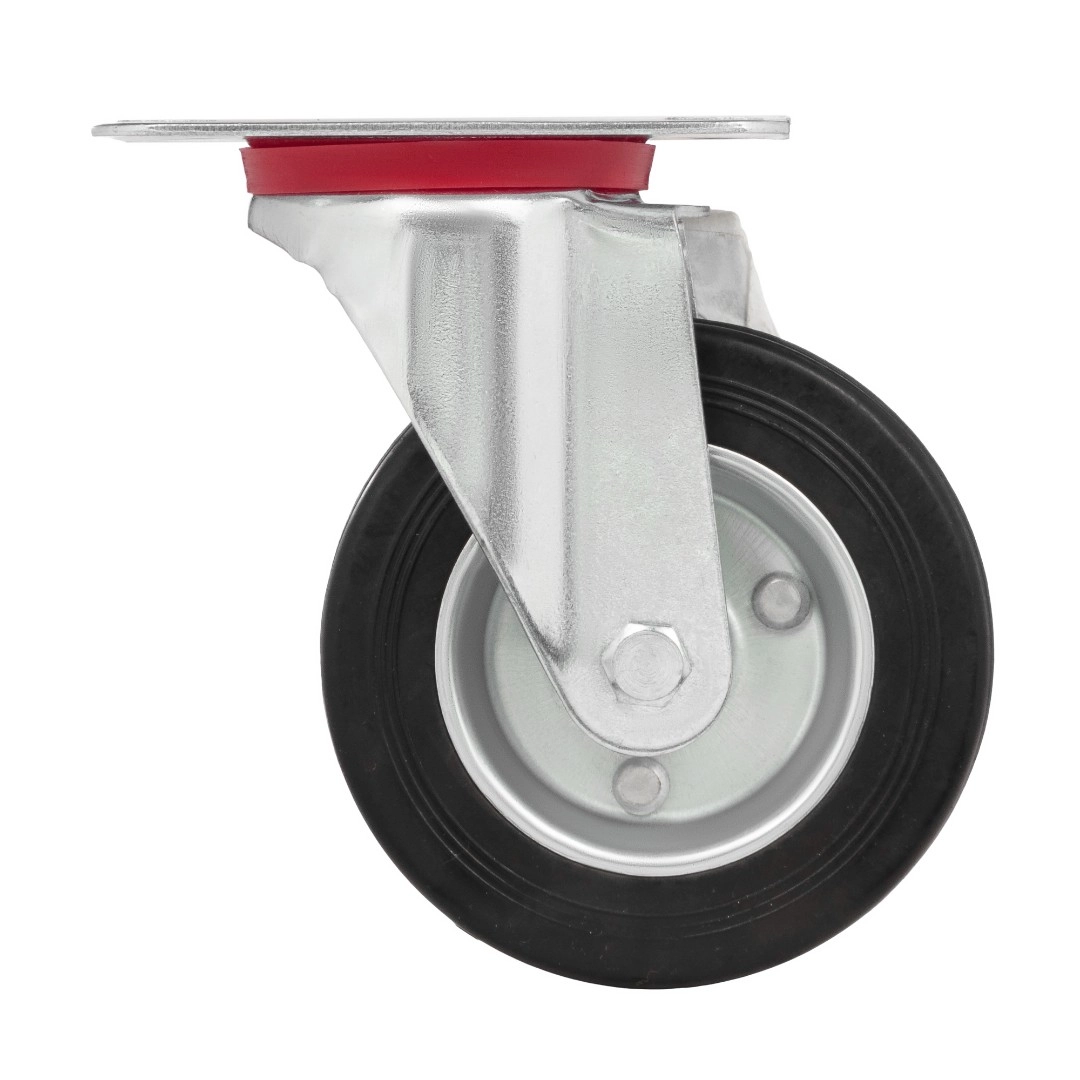 Колесо поворотное 4001-100, диаметр 100 мм., грузоподъемность 70кг., Колеса из черной литой резины, центр из двух гальванизированных дисков из штампованной стали. Роликовый (игольчатый) подшипник расположен в углублении, выдавленном под прессом, и содержит цилиндрические ролики подшипника. Кронштейн изготовлен прессованием из листовой стали. В поворотном узле двухрядный шарикоподшипник. Возможно применение на относительно грубых полах складов, заводов, производственных и строительных площадках. Данные колеса можно использовать на неровных поверхностях, во влажной окружающей среде и использовании вне помещения, не рекомендуется применять в среде с органическими растворителями, хлорированными веществами, гидрокарбонатами и минеральными маслами. Температура эксплуатации от -20 до +70С.