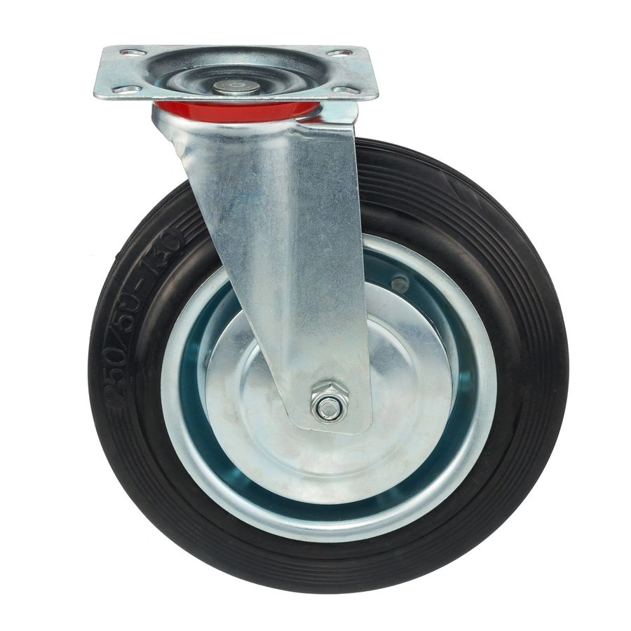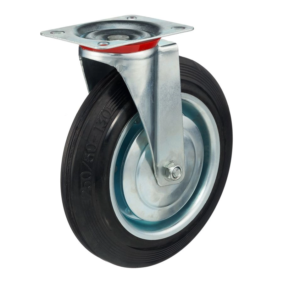 Колесо поворотное 4001-250, диаметр 250мм., грузоподъемность 210кг. Колеса из черной литой резины, центр из двух гальванизированных дисков из штампованной стали. Роликовый (игольчатый) подшипник расположен в углублении, выдавленном под прессом, и содержит цилиндрические ролики подшипника. Кронштейн изготовлен прессованием из листовой стали. В поворотном узле двухрядный шарикоподшипник. Возможно применение на относительно грубых полах складов, заводов, производственных и строительных площадках. Данные колеса можно использовать на неровных поверхностях, во влажной окружающей среде и использовании вне помещения, не рекомендуется применять в среде с органическими растворителями, хлорированными веществами, гидрокарбонатами и минеральными маслами. Температура эксплуатации от -20 до +70С.