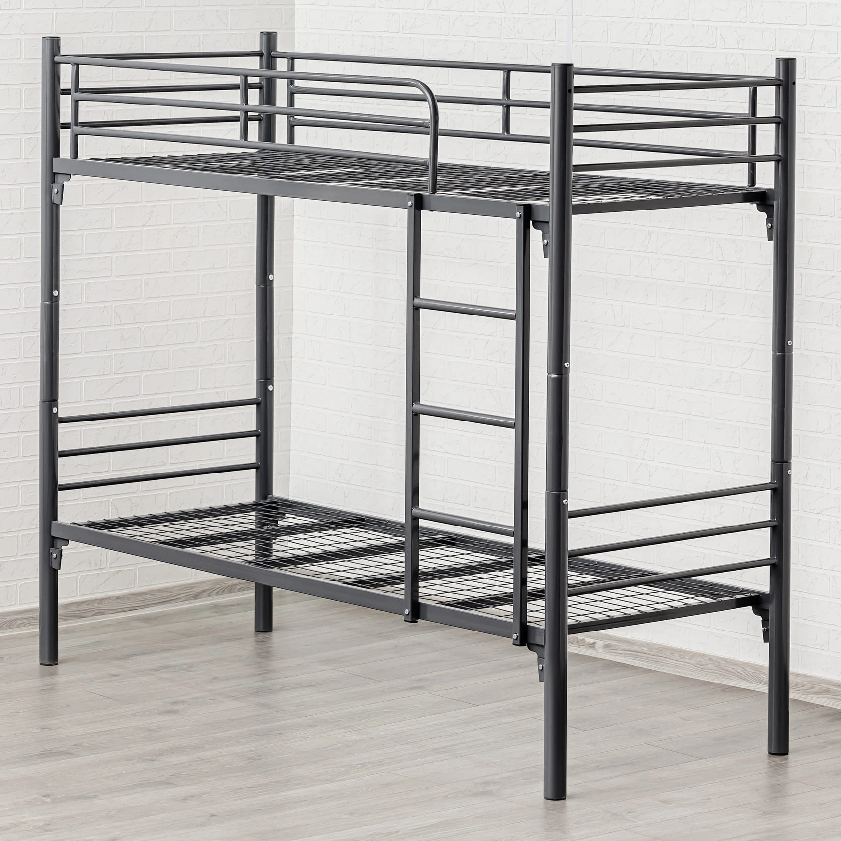 Спинки кровати выполнены в виде двух вертикальных колонок из круглых труб, диаметром Ø51 мм. и объединяющих их, трёх стяжек горизонтальных из труб круглого сечения Ø20 мм. Колонки объединены сваркой. Колонки спинок верхних (с отв. под крепление ограждения), одеты на колонки спинок нижних с помощью переходников. Спинки фиксируются Винтами М6х16 мм. Спинки в сборе имеют "П" - образную форму. Ложе (Рама) - прямоугольной формы, состоит из двух несущих, горизонтальных прямоугольных труб 40х20 мм. и соединяющих их, приваренных - пяти усилителей поперечных из квадратных труб сечением 25х25 мм. Сверху, к несущим трубам и усилителям поперечным приварена сетка сварная металлическая 700х1900 мм. с ячейкой 50*100 мм. и диаметром проволоки Ø3 мм. Ложе и Спинки жестко соединяются между собой при сборке, с помощью клиновых зацеплений (Клин+Петля) расположенных на раме и спинках, и изготовленных методом холодной штамповки из листовой стали. Клиновые соединения фиксируется винтами М6х16, шайбами 6 и гайками М6. Навесная лестница с тремя ступенями, изготовлена из квадратной трубы 25х25 мм. винтами М6х45 мм. и гайками мебельными М6, лестница жестко крепится к несущим трубам на рамах. На второй ярус устанавливаются ограждения - лицевое 270х1500 и заднее 270х1900 мм., изготовленные из круглой трубы Ø20 мм. с помощью винтов М6х70 мм., каждое из ограждений жестко крепится к несущим горизонтальным прямоугольным трубам рамы и спинкам. Открытые крепёжные отв. Ø8 мм., торцы труб спинок и лестницы закрыты пластиковыми заглушками, предохраняющими покрытие пола от повреждений и в декоративных целях. Кровать имеет защитно-декоративное покрытие, стойкое к загрязнению и механическим повреждениям, выполненное порошковыми эпокси-полиэфирными красками в электростатическом поле. Покрытие обладает длительным сроком эксплуатации и является экологически чистым, соответствует ГОСТ 9.410-88. Цвет покрытия - по шкале RAL. Кровать поставляется в защитной упаковке, в разобранном виде. Соответствует нормативным требованиям и ГОСТ 19917-2014.