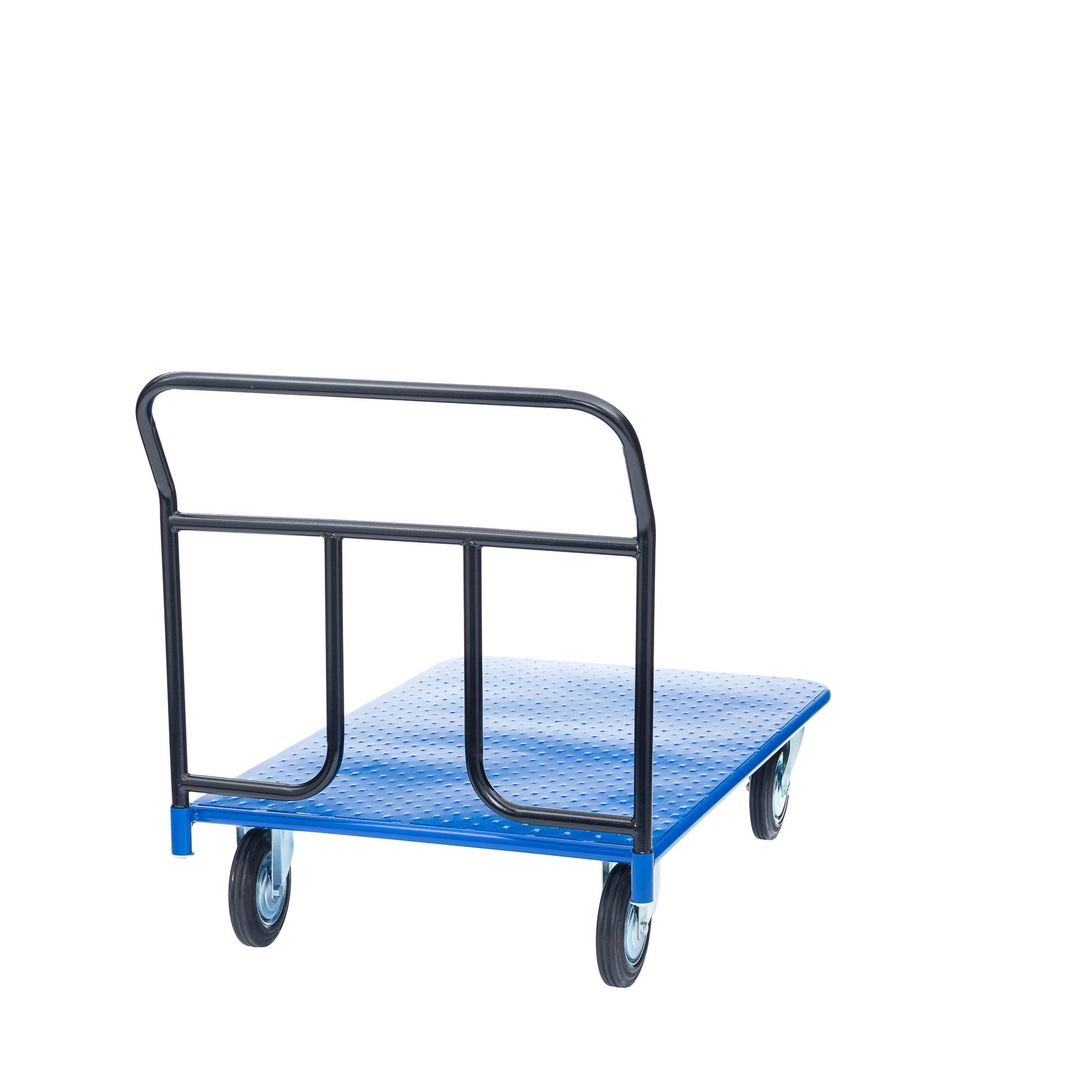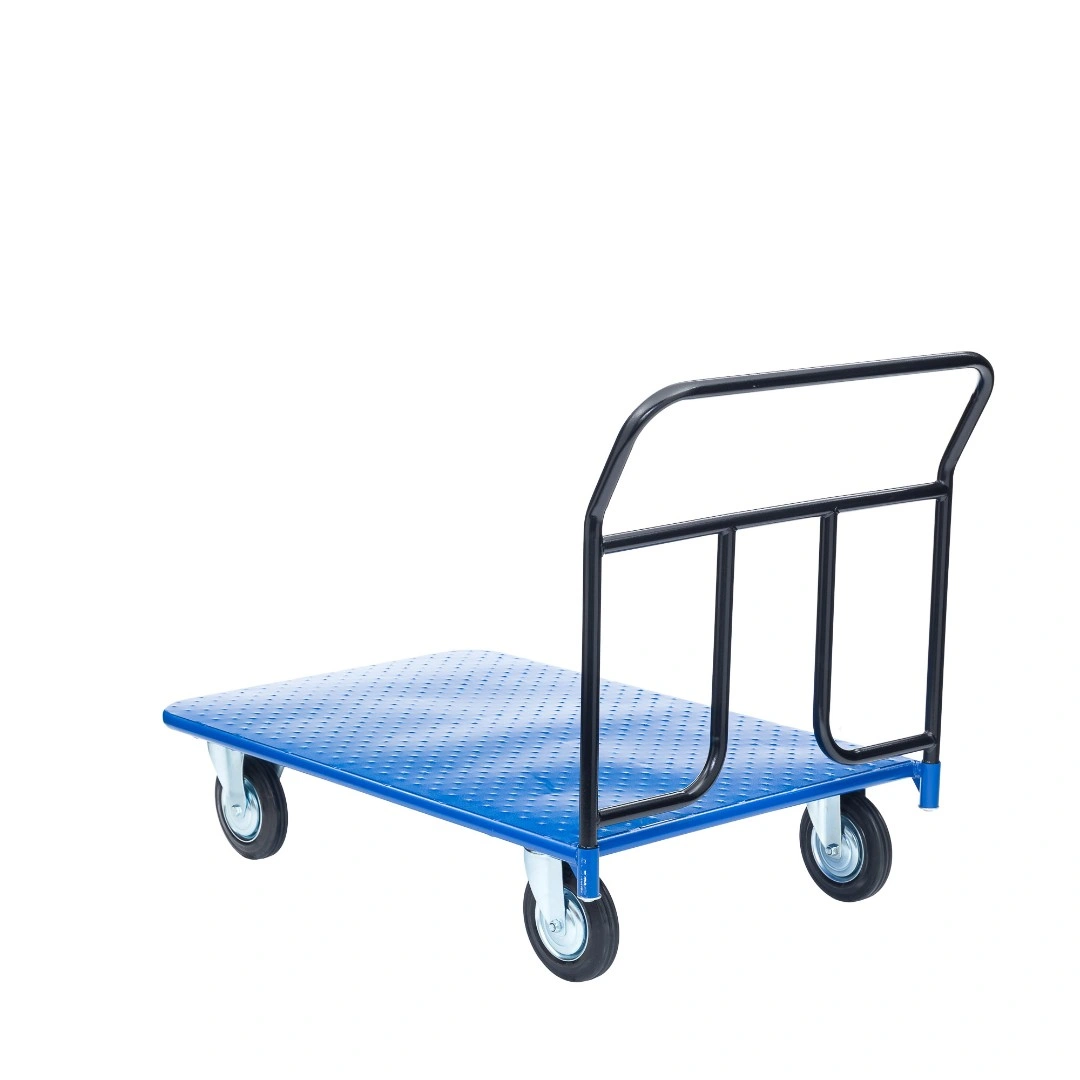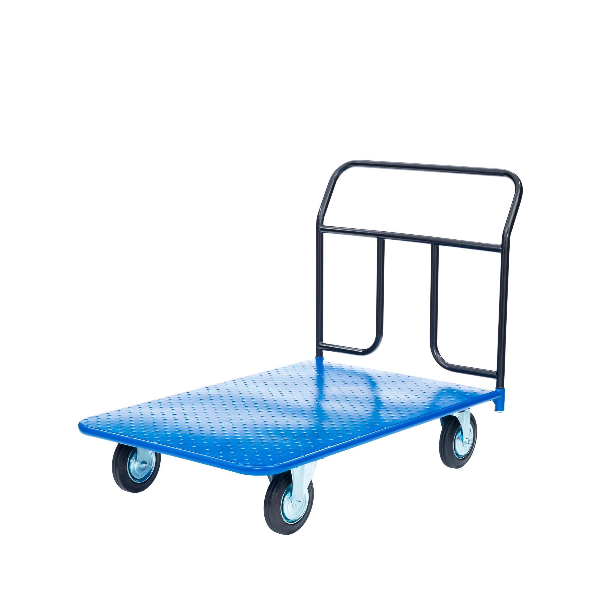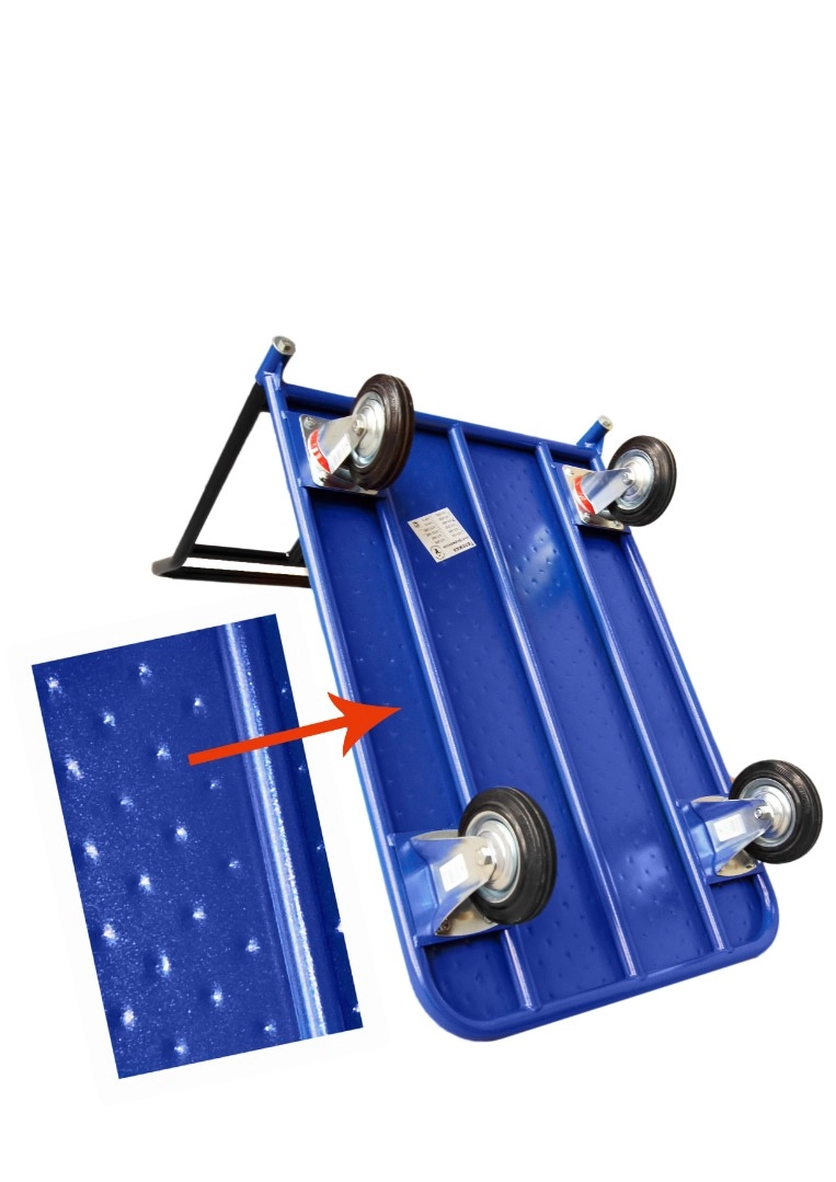 Платформенная 4-х колесная тележка КП-450-150-И используется для перемещения различных грузов в складских помещениях. Ручка крепится к платформе болтами, для компактного хранения можно снять, высота ручки 750мм. Платформа имеет уникальную рельефную, полимерную, противоскользящую поверхность, размером 700х1250мм. Цвет - синий, шагрень. Тележка комплектуется: метизами для крепления, двумя поворотными и двумя неповоротными промышленными колесами, диаметром 150мм., из черной стандартной резины, от всемирно известного, ведущего итальянского производителя Tellure Rota. Грузоподъемность до 450кг.